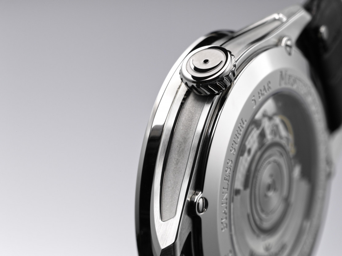 Tieši virs cipara 6 reizi sekundē griežas mazs ritenītis, tā sauktais “sun wheel”. Tas ir diskrēts veids, kā pārliecināties, ka pulkstenis darbojas, lai gan tas nemēra sekundes klasiskā veidā. Korpusa diametrs ir 40,5 mm, biezums apmēram 11,25–12,3 mm, ūdensizturība 5 bar (50 m). Safīra stikls ar AR pārklājumu priekšpusē, aizmugurē stiklots vāciņš (redzams perlamutra modulis un antracīta rotors ar trim fermatām). Kronis spirālveida, apdare dažāda: matēta, pulēta, smilšstrūklota.
